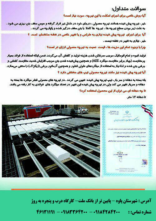 وی در پایان گفت: این تيرچه ها بر اساس مقررات و آئين نامه ها و تحت نظارت آزمايشکاه کنترل کيفي در تيپ هاي مختلف جهت استفاده در دهانه هاي مختلف تا 12 متر توليد و به بازار عرضه مي گردد.