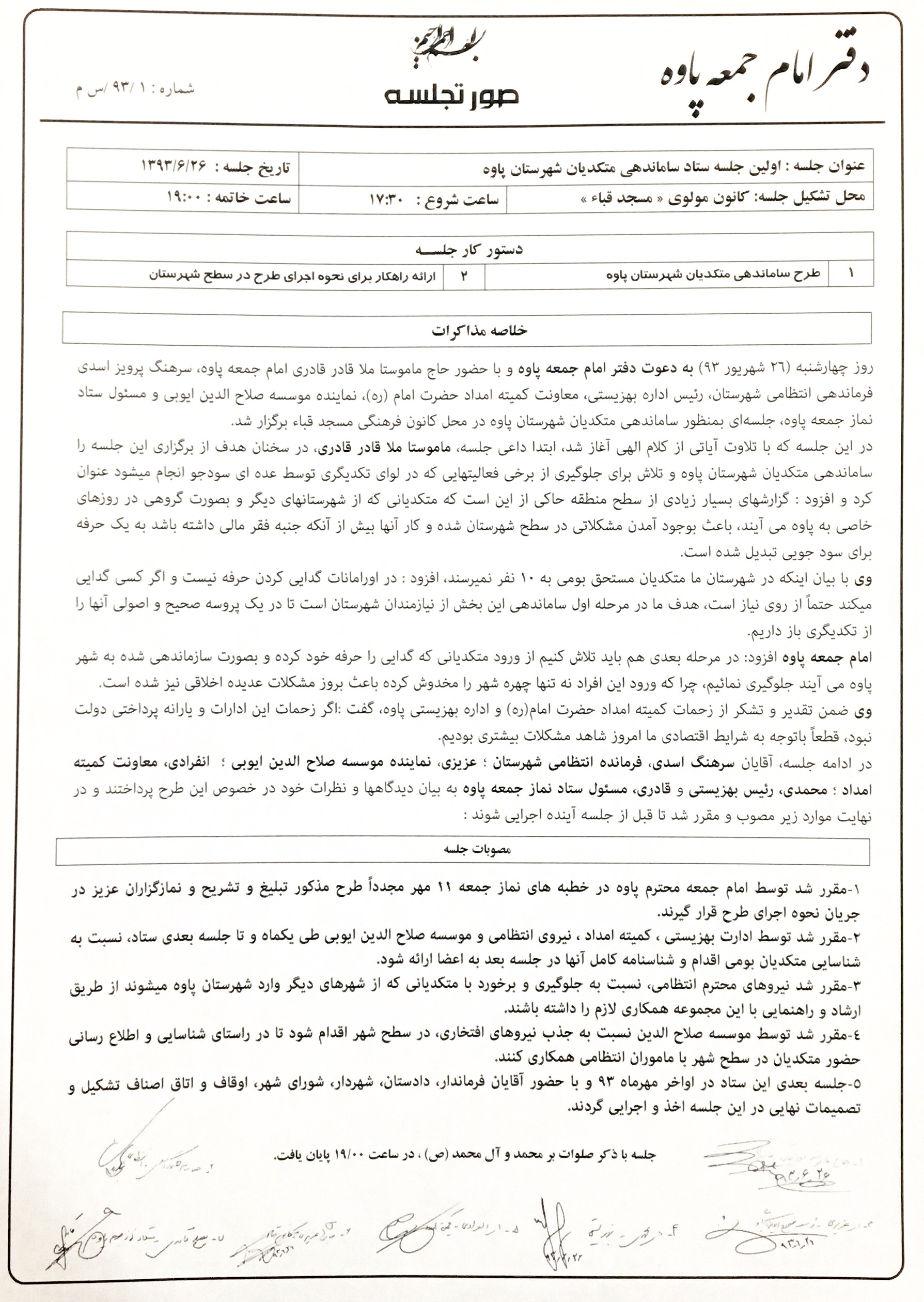 در ذيل نيز اولين صورتجلسه ستاد ساماندهي متكديان شهرستان پاوه كه در سال 1393 برگزار شده است انتشار داده مي شود.