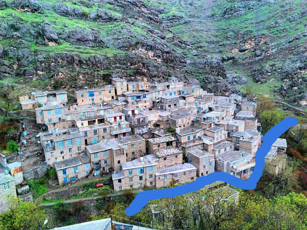 این روستا از جمله روستا هاي کوهستاني است که از نظر بافت داراي بافتي متمرکز بصورت پله اي مي باشد که از شمال به شهر نودشه از شرق به کوههاي منتهي به روستاي هجيج،از غرب به روستاي نروي و وزلی واز جنوب به رودخانه سيروان محدود مي گردد.